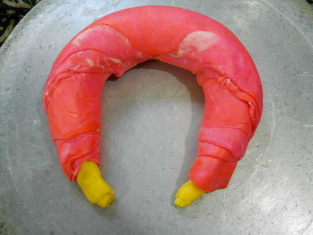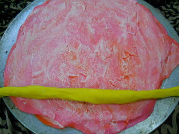 otra vez aplicar pasta sobre ella. n pone otro pan aplanado color rosa en ella.