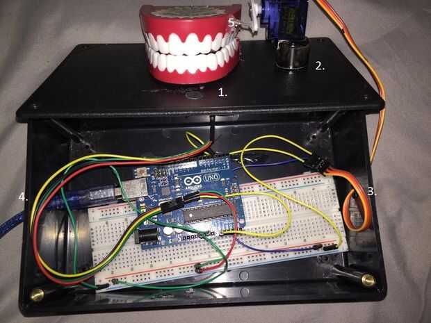 * Nota: Es muy importante que la capa inferior de los dientes y el servo son ambas bien montadas antes de ejecutar el sketch. No hacerlo podría causar el servo o sus uniones pegadas a romper.