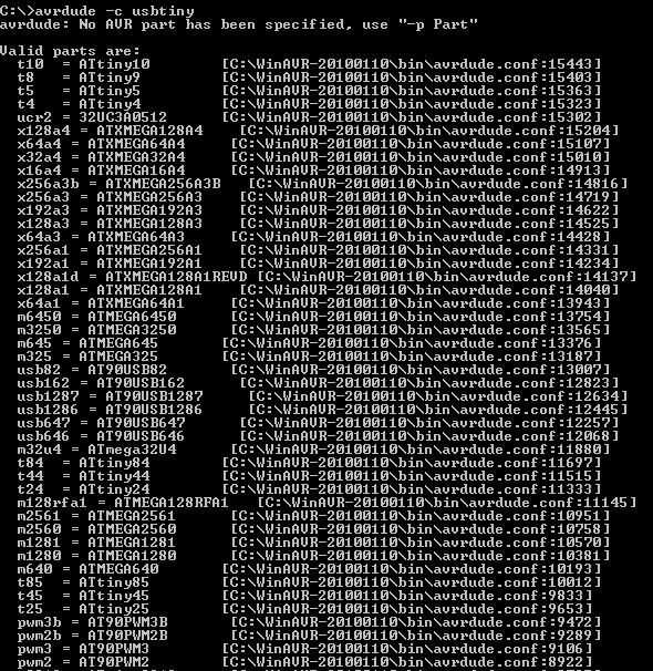 En vez de descargar los drivers, o siguiendo cualquiera de las direcciones de SparkFun, debe descargar el controlador USBTiny de Ladyada.net. Esta es la única solución que funcionó para mí con windows 7. Otros han usado otra solución exitosa, pero este parece de lejos el más fácil. Vi esto en un post en este foro: avrfreaks.net, para darles el crédito. Pero todo lo que necesitas hacer es descargar los archivos de controlador y punto de actualización del controlador del administrador de tu dispositivo a ese archivo para el driver adecuado. Entonces, si no ya sabes, para empezar a utilizar el programador necesitará descargar WinAVR, que incluye muchas cosas que se necesitan. Abra la línea de comandos y tipo: avrdude - c usbtiny. Esto trae la lista de microcontroladores, elige el tuyo y vuelva a escribir lo mismo pero añadir esto: -p (nombre del microcontrolador). Donde pongo microcontrolador nombre es donde pones el microcontrolador que tienes en la lista que sólo vio. Espero que esto ayude a quien lo necesita! Déjeme saber si usted necesita cualquier otro tipo de ayuda.