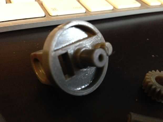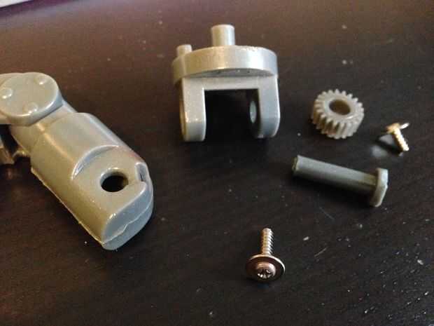 En la parte inferior de la placa superior, desenrosque la articulación del cuello (el tornillo que atraviesa el engranaje) y retire el conjunto del cuello/cabeza entera. Retire el cuello / cabeza montaje del cuello conjunto desenroscando el tornillo a través de la articulación del cuello y empujando hacia fuera del eje (necesita un poco de fuerza). Soltar el cuello / cabeza de la Asamblea y ponerlo a un lado por ahora.
