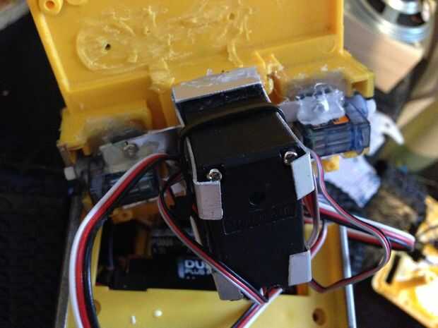 Con el fin de mantener la articulación del cuello al ras con la placa superior, vamos a crear un soporte para sostener el servo un poco lejos de la superficie. Use la plantilla adjunta para cortar de algún metal fino (yo usé una vieja sartén camping) una forma de soporte y curva redonda su servo, usando una brida de plástico para mantenerlo ajustado contra el servo. Utilizando los orificios de montaje tornillos del brazo original, coloque el soporte y doblar ligeramente hasta que el servo se coloca centralmente en la abertura de la placa superior. Si yo estaba haciendo esto ahora, probablemente crearía una parte impresa 3D, pero esto fue lo más fácil de hacer en el momento.