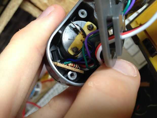 Nosotros te Encamine los alambres del ojo derecho, más en la caja del ojo izquierdo (vamos a poner un pequeño circuito en su interior, así que tenemos que unir todos los cables). El ojo derecho debe tener un cable verde, morado y negro. Usted debe haber previamente cortado el cable negro antes. El cable negro debe cablearse hasta el mismo pin como el cable morado. Como sólo necesitamos un cable por pin, basta con retirar el cable negro completamente.