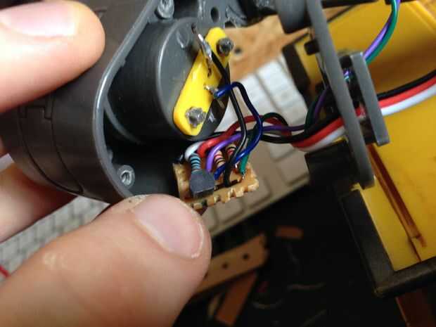 A continuación, cortar aprox. 5 pulgadas de cable de servo y pasar por la parte posterior en ojo izquierdo (puede que necesite hacer un agujero adicional), para soldar un extremo a la Junta del interruptor en el lugar apropiado según el esquema anterior.