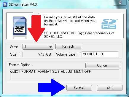 - Primero utilice SDFormatter para borrar todas las particiones en su dispositivo de almacenamiento según lo indicado por la flecha azul. Asegúrese de seleccionar el dispositivo correcto en el desplegable del menú mostrado por la flecha roja, o bien accidentalmente borra todos los archivos en otro dispositivo de almacenamiento. Accidentalmente de formatear una memoria USB una vez y fue un verdadero dolor para recuperar esos archivos.