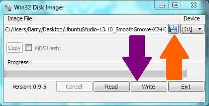 - Ahora abre a "Win32 Disk Imager" y seleccionar el directorio donde se extrae el archivo .img, como indicado por la flecha naranja. Otra vez Asegúrese de que tener el dispositivo correcto seleccionado en el menú desplegable. Luego simplemente haga clic en "Escribir" se muestra por la flecha morada y espere que la barra de progreso llegue al 100%. Una vez que haya terminado conectarlo a la ranura correcta de la Junta y compruébelo para asegurarse de que se instaló correctamente.