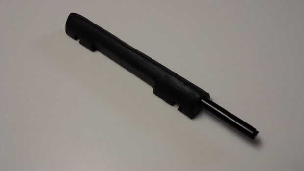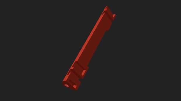 El apoyo de brazo móvil se desliza sobre dos extensiones de riel al caso de cuando el pestillo se tira hacia atrás. Mantener el apoyo de brazo móvil resbale demasiado lejos atrás cuando se expone la placa frontal, he añadido dos pins hacia la parte inferior de la caja. Los cortes correspondientes para cada una de estas protuberancias, así como por la extensión de la traba pueden encontrarse en el soporte de brazo móvil.