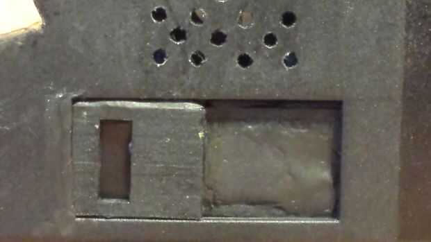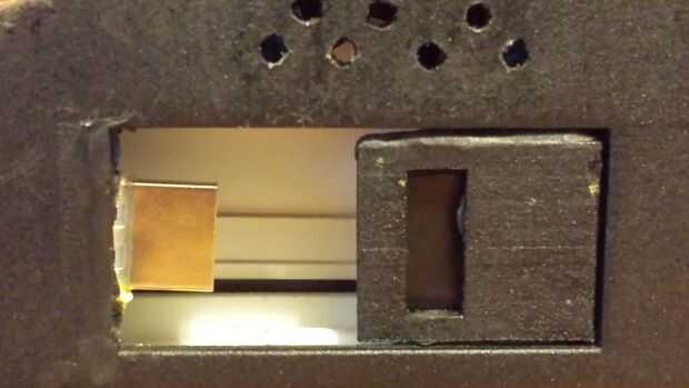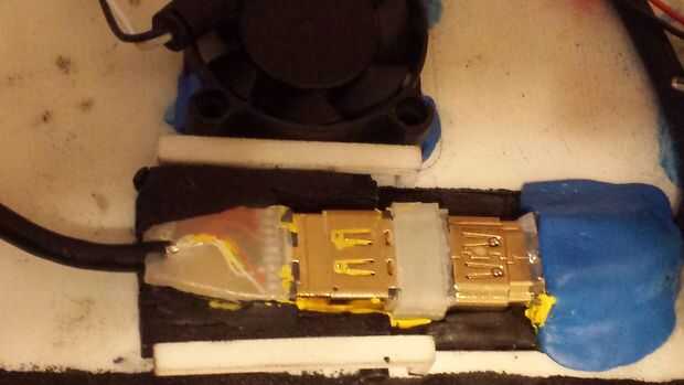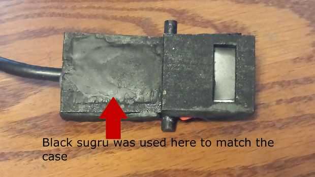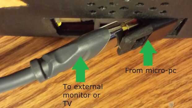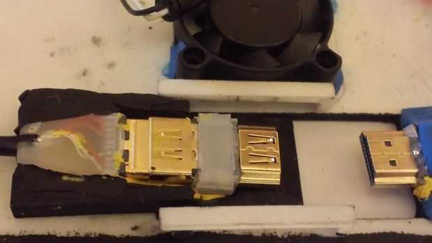 - El más grande extremo macho del cable micro hdmi-hdmi, así como el adaptador hdmi hembra-hembra fueron atados al pestillo de hdmi con sugru.