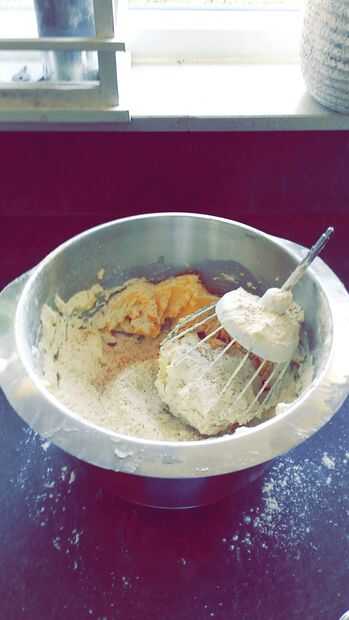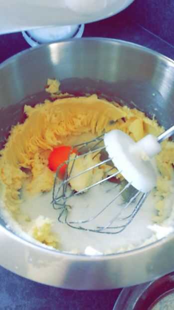 1) cortar la mantequilla en trocitos. 2) mezcla de la mantequilla. Agregar 3): huevo, azúcar y sal. 4) mezcla otra vez. 5) añadir la harina y el polvo de hornear. 6) Mix por última vez.