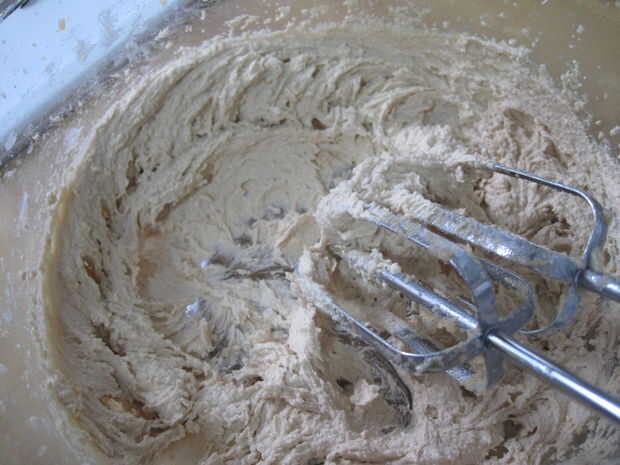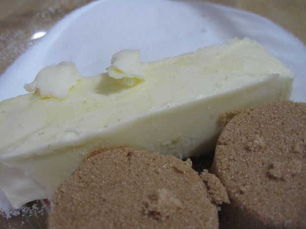 En un recipiente grande, crema de mantequilla (1 barra, suavizado.) y azúcares (1/2 cada uno marrón y blanco) hasta bonito y esponjoso.