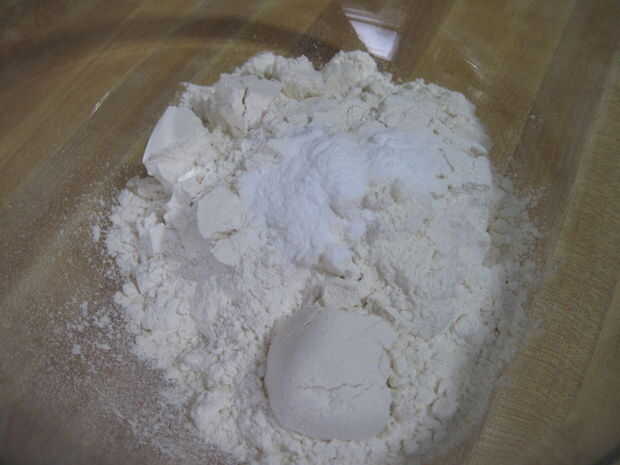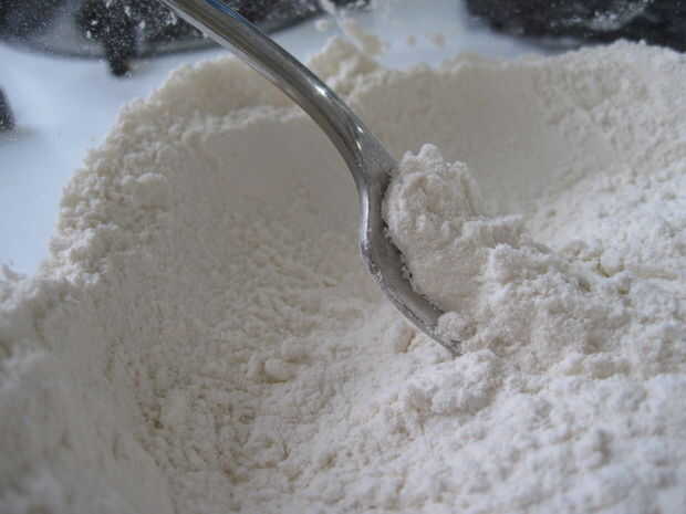 En un recipiente separado, mida 1 taza + 2 cucharadas de harina y 1/2 cucharadita de bicarbonato de sodio.