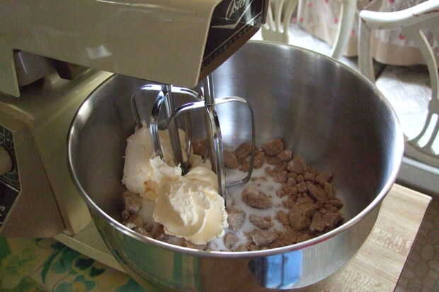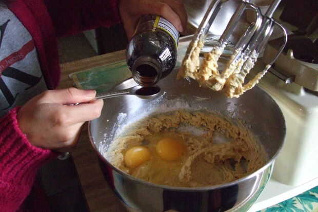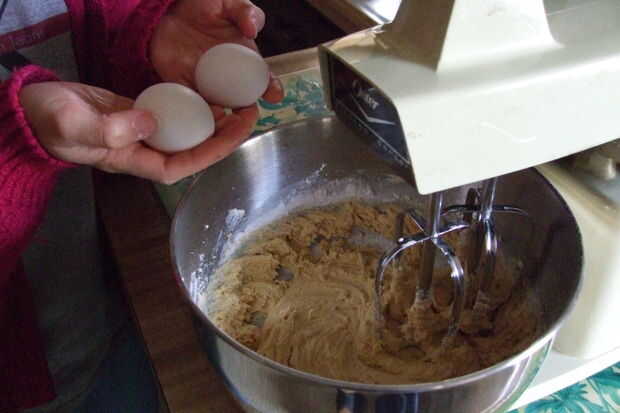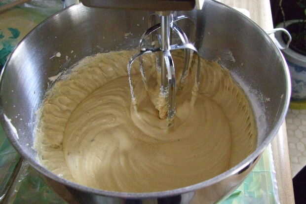 2. en un tazón grande, crema a la mantequilla, azúcar moreno y azúcar blanco. Batir en la mezcla de pudín instantáneo hasta que quede mezclado. Añada los huevos y la vainilla.