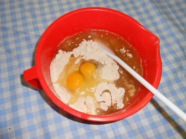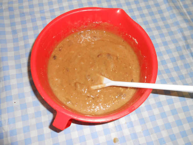 Añadir el resto de los ingredientes a las fechas y el agua con bicarbonato de soda en él. Los huevos, harina, azúcar blanca, azúcar morena, la cucharadita de bicarbonato de sodio, sal, vainilla y aceite.