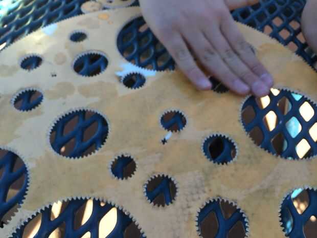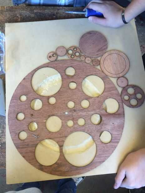 Cuando primero cortamos nuestros engranajes utilizamos madera fina. Funcionó bien al principio pero a medida que continuábamos trabajando con ellos se cayeron aparte. Decidimos cambiar al acrílico. Se ha celebrado juntos y funciona mucho mejor pero tuvimos que pelar todo esta extraña cinta de él primero.