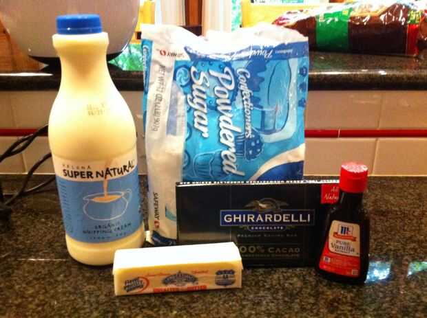 1 palo de mantequilla sin sal, ablandada azúcar 4 tazas en polvo 1 cucharadita de extracto de vainilla 6 cucharadas de crema batida pesadas 3 onzas de chocolate amargo, derretido y enfriado
