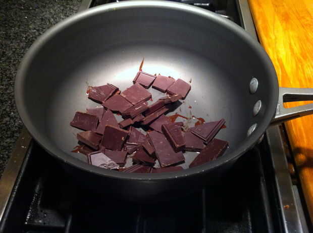 Romper el chocolate en trozos pequeños y colocarlo en una cacerola.  Derretir a fuego muy bajo removiendo de vez en cuando.  No la deje quemar!