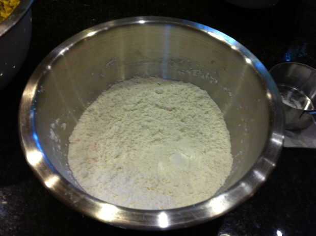 Poner la sal, bicarbonato, polvo de hornear y torta de harina en un tazón pequeño.  Revolver y apartar.