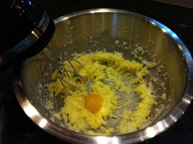 Separar los huevos y poner las claras en otro tazón.  Agregar las yemas uno a uno a la mezcla de mantequilla/azúcar y mezclar bien.