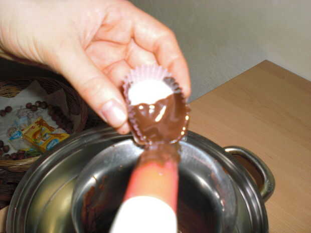 usando la brocha de silicona, elegir alguna crema y separado en el caso de dulces de papel suavemente, creando una capa de 1 mm fina en toda la superficie interior. puede convertir el caso de papel en la mano a una distribución suave de chocolate, sólo recuerda no presionar más fuerte evitar cualquier deformación de la presentación final.