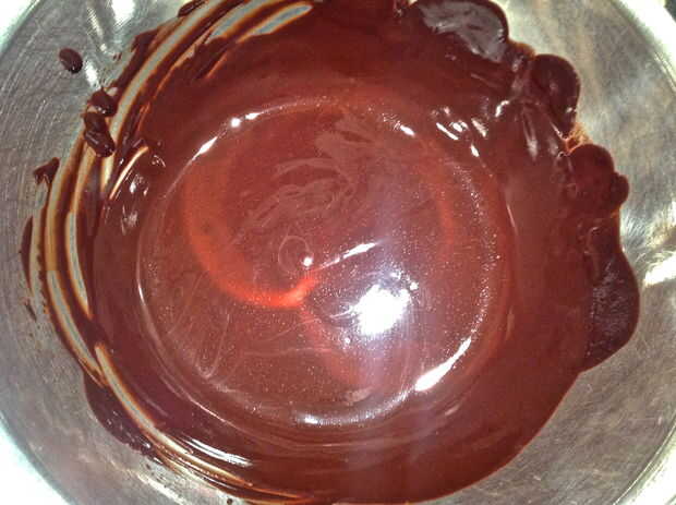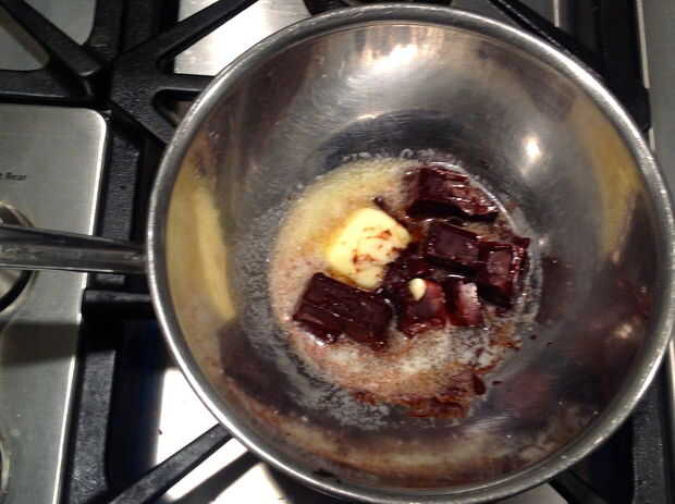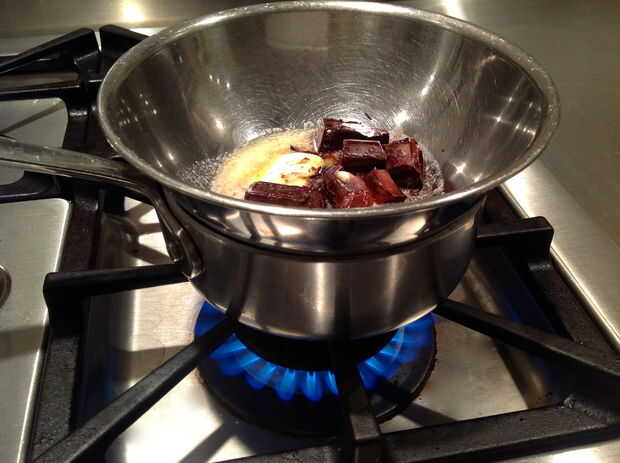 En un ajuste de calor medio, utilizar una caldera doble o coloque un recipiente grande de acero inoxidable sobre agua hirviendo y batir la mantequilla y el chocolate cuadrados... No utilice las fichas para este paso... Haz agregados más adelante a la masa. Después de todo la mantequilla y el chocolate se haya derretido, asegurándose de no sobre calentar los ingredientes, coloque un lado y deje que se enfríe...