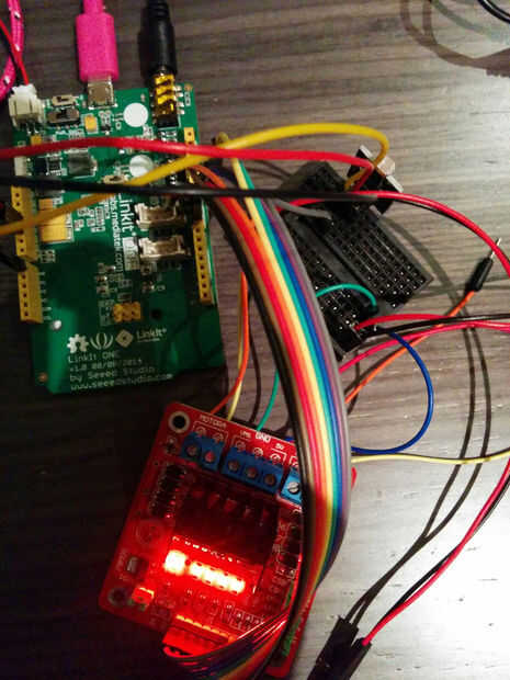 Conecte el IN1 y IN2 de la impulsión del motor L298n la D8 y D9 de LinkIt uno y ENA a 5v. No sé si es una buena idea, porque si vemos la documentación de la L298n ENA (Enable pin) le permite controlar la velocidad del motor con una señal PWM (pulso con modulación), pero funciona mejor que conectar directamente a la D3.