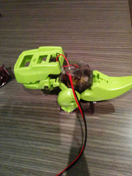 En primer lugar, construir su juguete solar de dinosaurio y quitar el panel solar. Después de que usted puede conectar el juguete a la batería un poco y verá cómo sus movimientos.