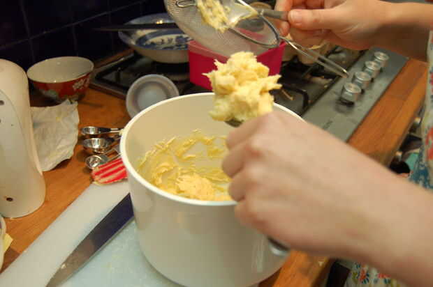 - Luego tamizar la harina y polvo de hornear y batir por otro 30 segundos o tan. Terminarás con una masa gruesa.