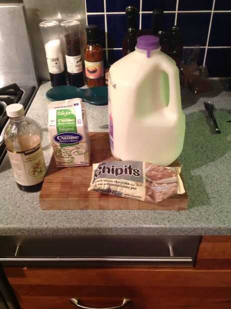 Lo que necesita para esta creación de bondad caliente es: 2 tazas de leche 2 tazas de crema mitad y mitad 8 onzas de chocolate blanco (chips o picado) 2 cucharaditas de extracto de vainilla Esta receta sirve a 4 personas