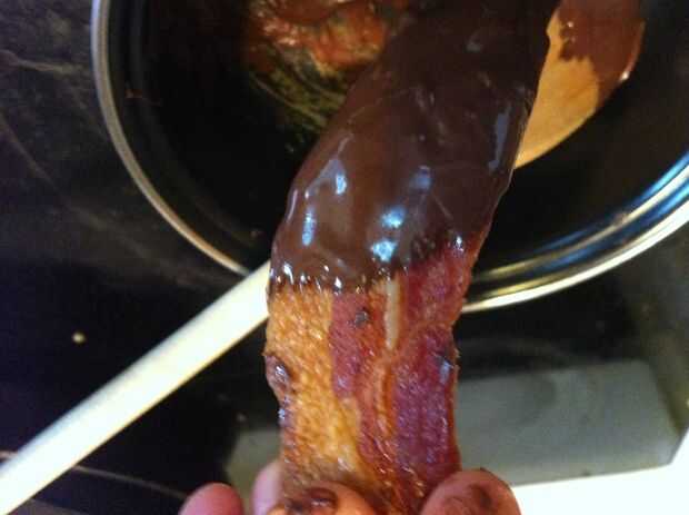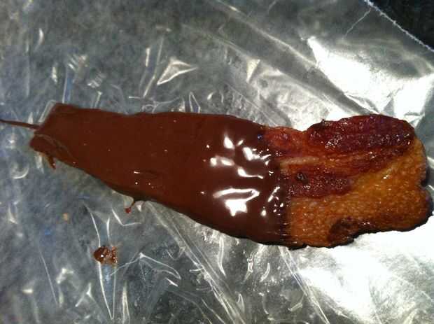 Una vez que el chocolate se derrita felizmente, inmersión sabroso tocino y ponerlo en papel de cera se enfríe.