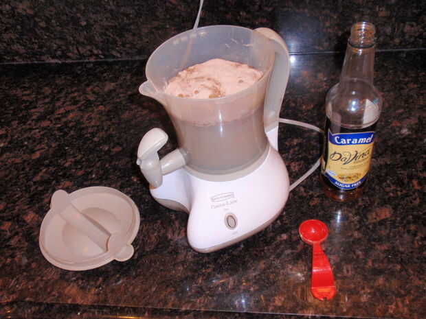 Jarabe vierta 2 cucharadas caramelo en mezcla.