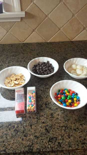 Estoy usando M & Ms, rosquillas, chocolate blanco y granas