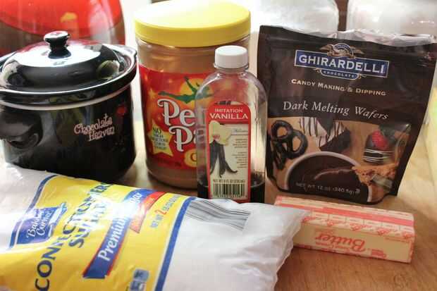 Ingredientes: 2 tazas de cacahuate 3 tazas conectados azúcar 2 cucharaditas vainilla 1/2 taza de mantequilla (1 barra) bolsa de 12 oz de la fusión de chocolates