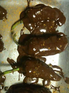 Sostiene que el caramelo recubiertos habaneros por el vástago, rodillo cada pimiento rápidamente en la mezcla de chocolate.