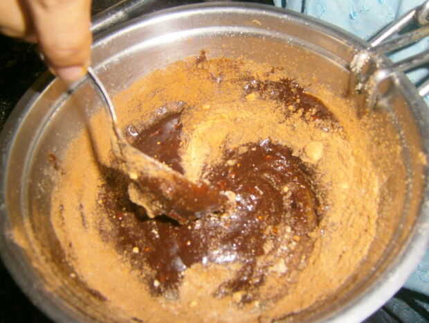 Añadir la mezcla de cacao-leche en polvo poco a poco (en pequeñas cantidades a la vez) y mezclar bien hasta brillante.