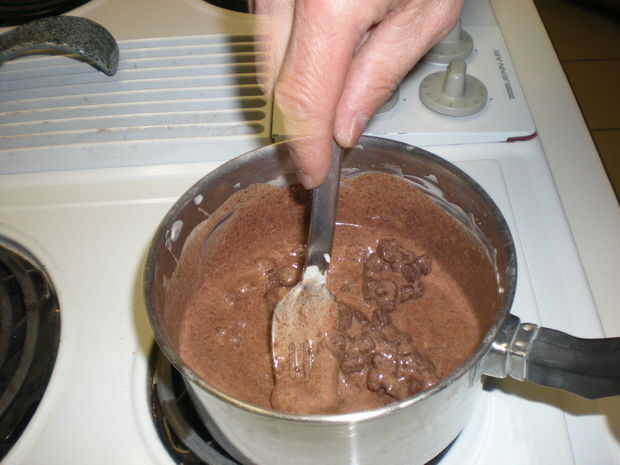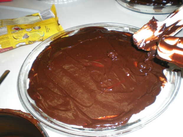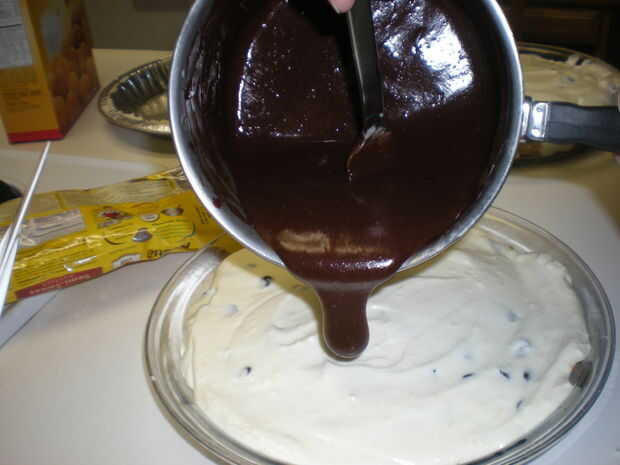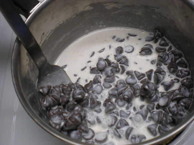 La última parte principal de esta torta es el relleno. Poner los trocitos de chocolate restantes (1 taza) y el heavy batir en una cacerola pequeña. Coloque a fuego bajo (muy bajo) y revuelva constantemente hasta que se derritan los chocolates. Retire de la hornilla y continuar revolviendo hasta que se convierte en un marrón oscuro. Verter sobre ambos pies y extiende uniformemente. Poner los pies en la refriderator de 2 1/2 horas.