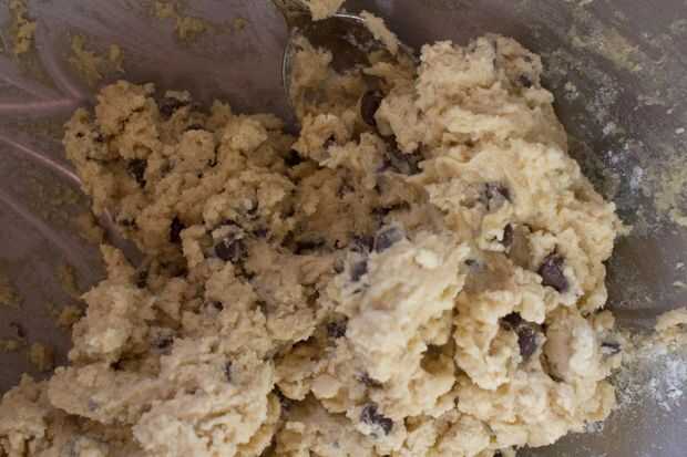Crema de la mantequilla y el dos azúcar junto durante tres minutos en el mezclador. Luego agregar la leche y el extracto de vainilla en la batidora y mezclar hasta combinar. Añadir la harina y la sal y mezclar hasta que la masa sólo juntos y luego añadir a mano las virutas de chocolate mini.