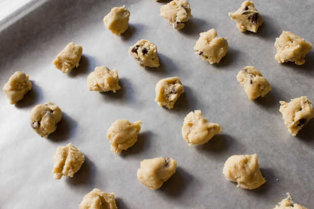 Pode colmada de 1/4 de cucharadita de tamaño (la punta de su dedo meñique para aquellos de ustedes que quieren al globo ocularlo) trozos de masa de galleta en una bandeja para hornear. Coloque en el congelador hasta que sólido. Una vez congelado, se pueden colocar las piezas de masa de galleta en una bolsa de congelador-safe o recipiente para almacenar para uso posterior.