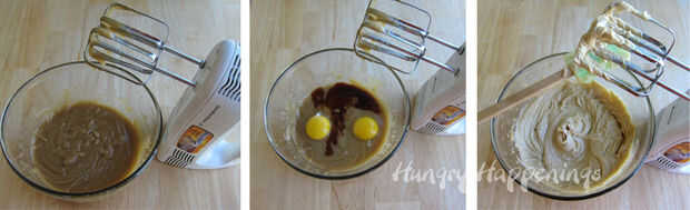 Derrita la mantequilla en un tazón. Añadir el azúcar moreno y azúcar granulada y batir a velocidad media hasta que estén bien mezclados. Agregar el huevo, la yema de huevo, y extracto de vainilla y batir hasta completamente incorporado.