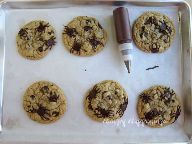 Tubo araña cabezas y las piernas alrededor de unos chips de chocolate a cada galleta. Deje que se seque.