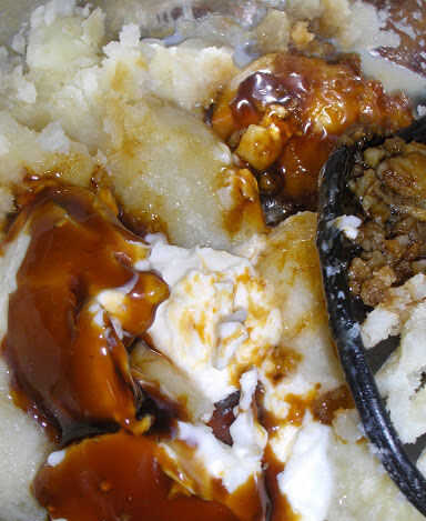 Escurrir las patatas, añadir la leche y la margarina a patatas y puré bien. Agregue los ingredientes restantes.