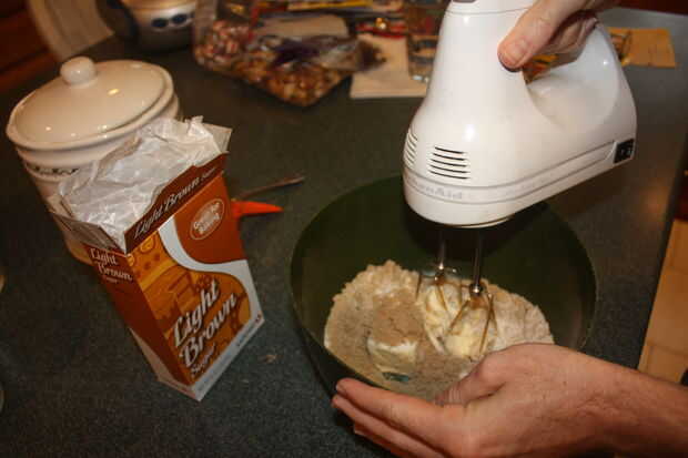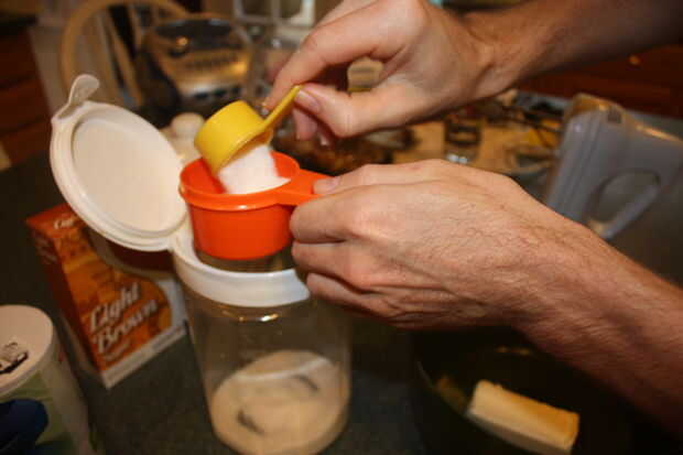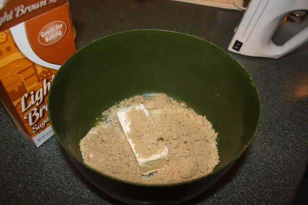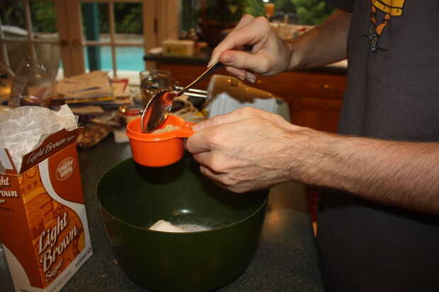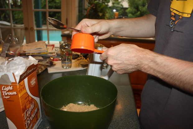 Mida 1/2 taza de azúcar moreno y agregue a la mantequilla en el tazón de fuente. Hacer lo mismo con el azúcar granulado (blanco) y añadir a la cubeta, así.