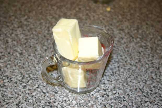 Parcialmente derretimiento 1 1/2 barritas de mantequilla real.  Cortar el palo completo por la mitad para facilitar el proceso de fusión.  Poner en un horno de microondas en la posición de descongelación para cerca de 1/12 minutos.