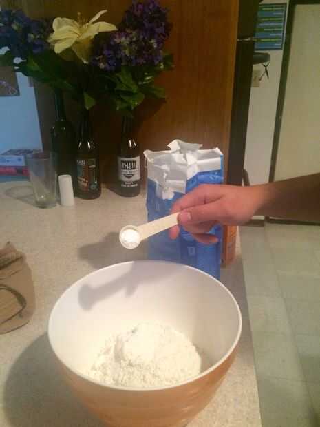 En un tamaño mediano cuenco, agregar juntos los ingredientes secos de 2 1/4 tazas de harina, 1 cucharadita de bicarbonato de sodio y 1 cucharadita de sal.