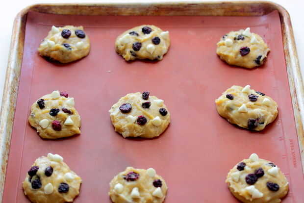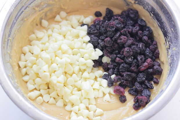 Adictivo White Chocolate Chip cookies que utiliza arándanos secos en lugar de frescos