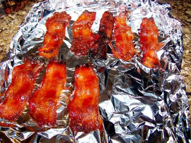 Echar todo en el horno y hornear durante 15-20 minutos (medio giro), o hasta que se derrita el azúcar y el tocino es bastante crujiente. Luego cortar el tocino en trozos pequeños para las galletas.