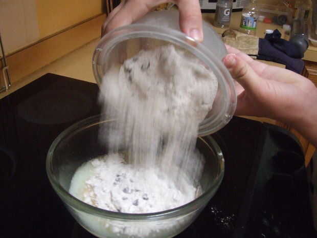 Verter el contenido del tazón de fuente "Ingrediente seco" (harina, sal, bicarbonato de Soda, Chips de Chocolate, azúcar) en la taza del "Ingrediente húmedo".