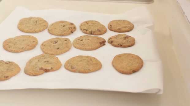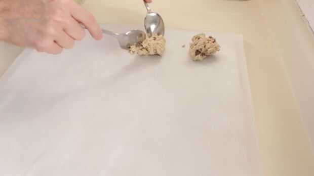 Luego tomar la masa y forma bolitas y colocar en una bandeja para hornear galletas. Estoy usando papel de pergamino. También estoy usando dos cucharas para obtener la masa, pero también se puede utilizar un helado cucharada, los gran trabajan, y hacen la misma cookie de tamaño más o menos cada vez, que realmente ayuda el proceso de cocción. No debe preocuparse sobre cookies de diferentes tamaños de cocina más o menos entonces otros. Ahora usted hornea sus galletas a 350 grados F durante unos 10 minutos. Si quieres un poco más suave, sacan después de 9 minutos y luego los dejo reposar unos minutos (el continuará cocinándose) luego ponerlos sobre una rejilla para galletas. Si gustan más crujientes, detrás de unos 11 minutos y luego hacer lo mismo, que descanso, luego poner sobre una rejilla.