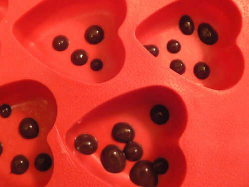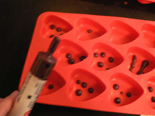 Para añadir puntos y garabatos, por supuesto se puede utilizar una manga pastelera, pero una manera rápida y sucia de hacerlo es utilizar una jeringa dispensador de la medicina, solo chupar su chocolate y punto detrás hacia fuera otra vez. Encontré que puntos de chocolate blanco de chocolate regular trabajaban bastante bien, pero en chocolate blanco de chocolate oscuro no 'stick' también. Sospecho que trabajaría mejor si usted ha utilizado diferentes colores de chocolate blanco teñido, por lo que no tiene el problema de diferentes consistencias.