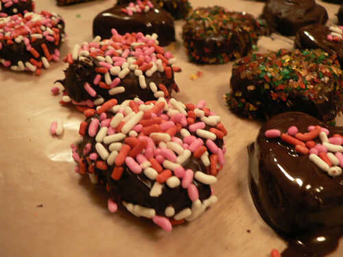 Sumerja su corazón en el chocolate derretido tenazas pequeñas, que se separa en el chocolate con la espátula si su espesor bastante. Cuando usted tiene completamente cubierta, coloque en un plato pequeño llenado con chispitas de caramelo (u opcionalmente, directamente sobre el papel de cera). Espolvorear chispitas de caramelo en la parte superior. Permiten establecer brevemente, a continuación, quitar al papel encerado. Cuidado, tomará un tiempo para solidificarse, por lo que no se tocan!