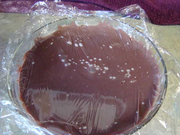 Una vez que el budín ha llegado a hervir, retirar del fuego y vierta en un recipiente.  Si izquierdos descubiertos, más cocidos postres crean una "piel" en la parte superior como se refresca.  No queremos esta piel, así que coloque una hoja de plástico sobre el pudín, haciéndolo entrar directamente en contacto con el pudín.  Coloque el recipiente de pudín, en la nevera y dejar enfriar.