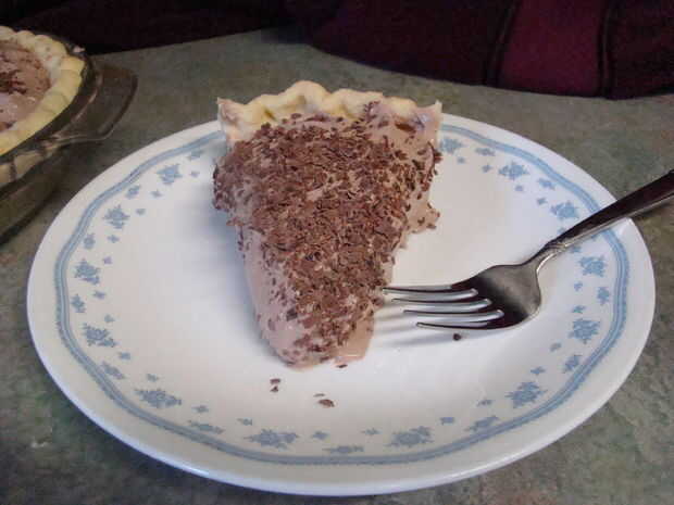 Mantener refrigerado hasta que los sirvió.  Como fui creciendo, pensé que esta era la única manera, Chocolate Cream Pie fue hecha.  Mi maridito, que no le gusta el "Pastel" le gusta esto.  De luz una crema y si quieres un sabor chocolate profundo, hacerlo con Pudin de chocolate oscuro.  Si lo pones en una concha de pastel de 8"(en lugar de 10" como esta), será más alto y más majestuoso.  ¡ Disfrute!